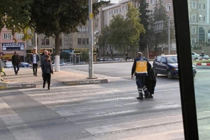 Adıyaman'da vakadan dönen bir ambulansın şoförü, aracı yol kenarına park ederek karşıdan karşıya geçmeye çalışan yaşlı kadının yardımına koştu. Ambulans şoförünün duyarlılığı takdir topladı.