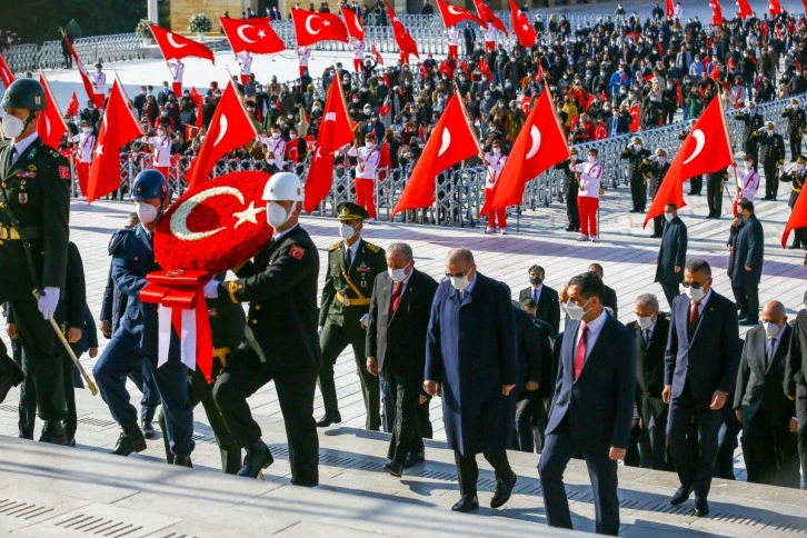 Törende Cumhurbaşkanı Erdoğan, TBMM Başkanı Mustafa Şentop, Cumhurbaşkanı Yardımcısı Fuat Oktay, CHP Genel Başkanı Kemal Kılıçdaroğlu, MHP Genel Başkanı Devlet Bahçeli, İYİ Parti Genel Başkanı Meral Akşener, Cumhurbaşkanlığı Kabinesi üyeleri, yüksek yargı temsilcileri, siyasi parti temsilcileri, Genelkurmay Başkanı Orgeneral Yaşar Güler ve kuvvet komutanları ile birlikte Aslanlı Yol'dan yürüyerek Atatürk'ün mozolesine geldi. Mozoleye çelenk bırakılmasının ardından saygı duruşunda bulunuldu ve İstiklal Marşı okundu. Heyet, daha sonra Misak-ı Milli Kulesi'ne geçti. Anıtkabir Özel Defteri'ni imzalayan Erdoğan, kendisini alkışlayan vatandaşları selamladı. Erdoğan, daha sonra MHP Lideri Bahçeli ile birlikte Anıtkabir'den ayrıldı.