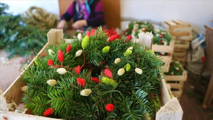 Bazı kadınların firmaların atölyelerinde çalıştığını belirten Atik, "Çemberlere dalları sarıyoruz, üzerine kozalak, okaliptus, kuşburnu, kızılcık, alıç, dağ çileği, kırmızı meyveler yerleştiriyoruz." ifadesini kullandı.