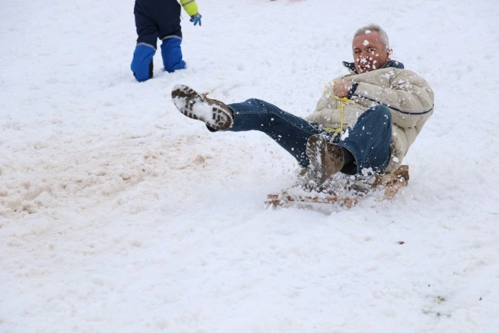 Ankara'da geçen hafta etkili olan kar yağışının ardından Başkent'te yaşayan vatandaşlar, Elmadağ Kayak Tesisleri'ne akın etti. 7'den 70'e karın tadını çıkarmak isteyenler, kızaklarını alıp burada kendini tepeden aşağı bırakarak kaymaya başladı. Zirveden aşağı doğru kızakla kayanlar, zaman zaman hızını alamayarak düştü. Torununu alıp gelen dedeler, çocuğuyla eğlenmek isteyen aileler ve özellikle de çocuklar keyifle kayarak eğlenceli dakikalar yaşadı. Başkentlilerin yoğun ilgi gösterdiği kar keyfi havadan görüntülendi.