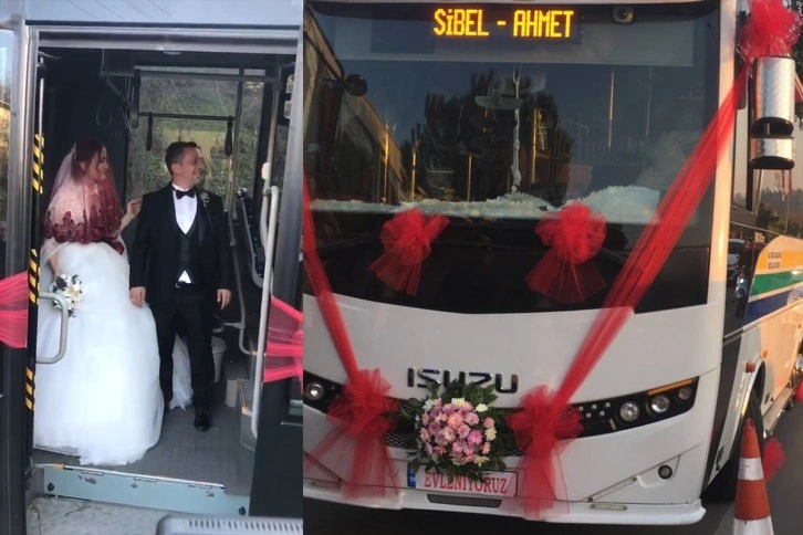 Düğün aracı yapılan otobüsteki Led ekranda “Nikahımıza Hoşgeldiniz, Sibel - Ahmet” yazdığı görüldü.