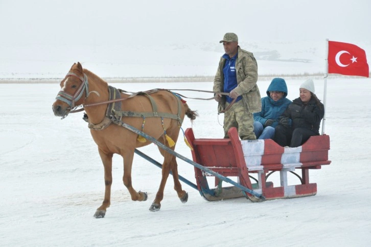 Çıldır Gölü’nde dörtnala atlı kızak keyfi