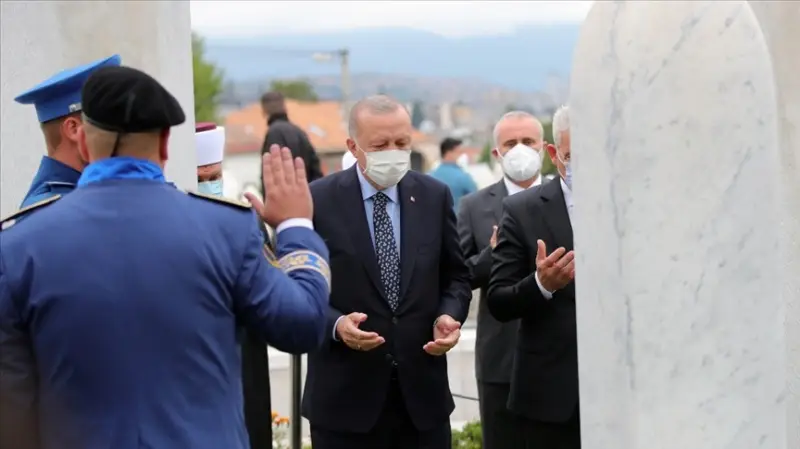 Kovaçi Şehitliği'ne girişinde kendisini bekleyen vatandaşları selamlayan Erdoğan, Meçhul Asker Anıtı'na ve Aliya'nın mezarına çelenk bıraktı, dua etti.