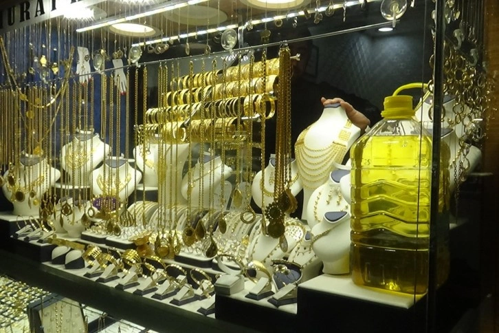 Tüm yurtta olduğu gibi Diyarbakır'da da bazı fırsatçılar yüzünden son zamanlarda gıda ürünleri arasında yağ fiyatlarında stokçular nedeniyle uygulanan orantısız zamma dikkat çekmek isteyen kuyumcu, altın vitrinine sıvı yağ bıraktı.