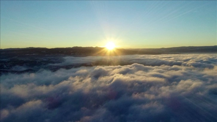 Dağların eteklerinde adeta denizi andırmasıyla güzel manzara sunan sis bulutu, dron ile de görüntülendi.