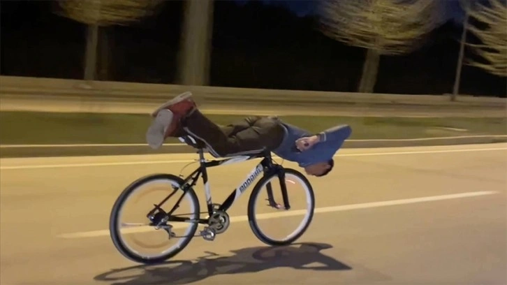 Kentte akşam trafiğin yoğun olduğu İpekyolu'nda 2 genç, bisikletlerine uzanarak trafikte ilerledi.