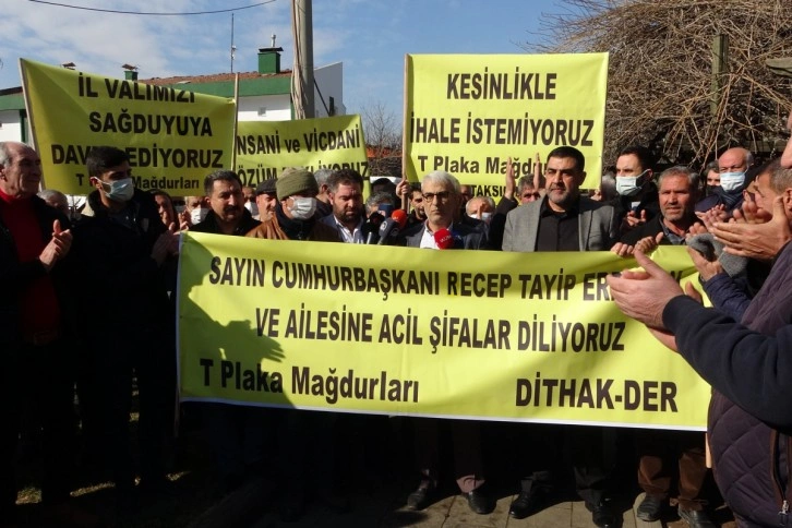 HDP'li belediyenin mağdur ettiği Diyarbakır T Plaka Hak Sahipleri Yardımlaşma ve Dayanışma Derneği DİTHAKDER, Cumhurbaşkanı Recep Tayyip Erdoğan ve eşine geçmiş olsun pankartları açtı, T plaklarıyla ilgili açıklama yaptı. DİTHAKDER Başkanı Ahmet Arslan ve taksicilerin katıldığı açıklamada Dernek Başkan Yardımcısı Hasan Nadiroğlu,13 yıldır mağduriyet yaşadıklarını söyledi. 2011 yılında bedelini ödeyerek, herkesin uymak zorunda olduğu yasaların ilgili maddelerinin Büyükşehir Belediyesine verdiği yetki çerçevesinde 914 ticari taksi plakası aldıklarını anımsatan Nadiroğlu, “Ancak samimiyetle belirtmek isteriz ki, o gündür bu gündür biz ve çocuklarımızın hayatı allak bullak oldu. Bir diğer deyimle hem evimize ekmek götüremedik hem de yapılan keyfi uygulamalar karşısında intihar derecesine geldik. Trafik tescil belgemiz, ödediğimiz bedel ve adımıza tahsisi yapılan plakalarımızın adeta gasp edilerek, işlevsiz bırakılmasından sonra yargıya başvurduk ve kazandık. Mahkeme kararından sonra belediye ‘Şehrin gelişimine paralel olarak 10 yıl sonra aktifleştirilecektir' kararı aldı. Aldı ancak, belirlenen zaman ve çok büyük ihtiyaç olarak belli olan ticari taksi gerekliliği kötü niyetli ve haksız planlarla bir türlü bize teslim edilmedi. Diyarbakır T Plaka Hak Sahipleri Yardımlaşma ve Dayanışma Derneği çatısı altında birleştik ve valimizden defalarca randevu istedik, eğer randevu alsaydık bu konuda valimizin çok iyi niyetine rağmen kendisini yanıltanlara fırsat olmayacaktı. İlk kayyum Cumali Atilla şehir master planı yapmak sureti ile plakalarımızı aktifleştirecekken, seçim süreci başladı. Akabinde seçimden sonra kayyum olarak atanan Hasan Basri Güzeloğlu da aynı çalışmayı yapıp bitirdi. Ancak yerine İl Valimiz Münir Karaloğlu geldi. Çabamız ve gündeme getirmemiz karşısında adımıza tescilli ve tahsisli plakalarımızı ihale ile verme kararı aldılar” dedi.