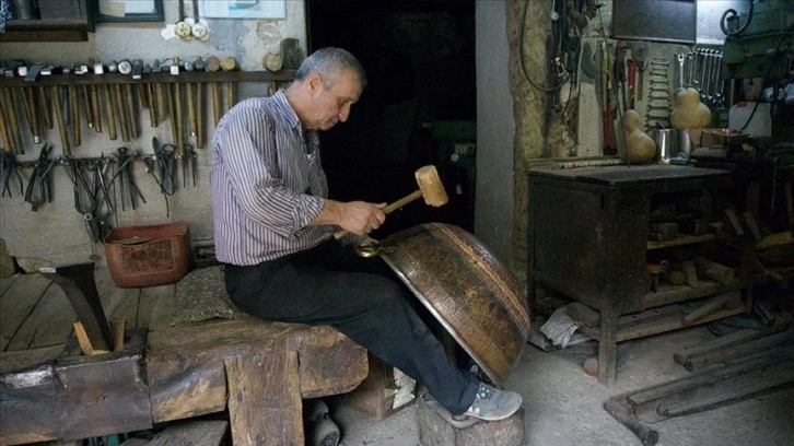 Kazanlarla buluşan tokmak seslerinin yükseldiği tarihi han içerisinde, Kaya kardeşler yıllardır bu işi severek yapıyor.,