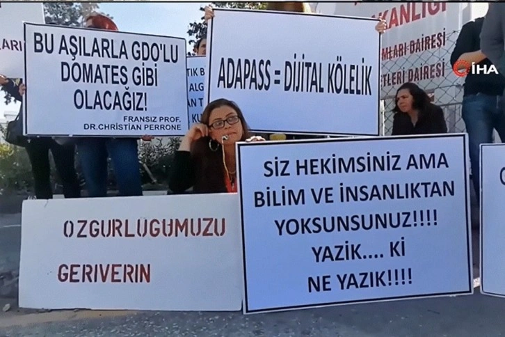 KKTC'de korona virüs salgınında aşı, maske ve PCR testi uygulamaları devam ediyor. Hükümetin aldığı önlemlere karşı çıkanlar, Sağlık Bakanlığı önünde eylem yaptı. Eylemciler, “Bu aşılarla GDO'lu domates gibi olacağız”, “AdaPass dijital kölelik”, “Özgürlüğümüzü geri verin”, “Gerçek bilim insanları insanlığa hizmet eder küresel çeteye değil”, “İnsanları ölüme terk ettiniz”, “Nerede sizin Hipokrat yeminimiz” yazılı pankartlarla dikkat çekti.Sağlık Bakanlığı önünde bir açıklama yapan sözcü Tuğçehan Ören, “Bu aşılar insanların hayatlarını sonlandırıyor. Bir yemeği yapan önce yemeğin tadına kendi bakar, bugün aşı üretici ve çalışanlarının hiçbiri aşı olmadı. Onların olmadığı aşıyı biz niye yapalım? Bize kimse bunları ceza ve dayatmalar ile yaptıramaz. Bizlere ilk başta ilk doz aşı yapılacak, bu hastalık bitecek dediler. Şimdi 9 doza kadar bu aşılamalar devam edecek. Çünkü bu aşıların içinde ‘grafen oksit' vardır. Sizlerin vücuduna bunları yüklemeye çalışıyorlar. Aşıyı üreten firmalar sorumluluğunu üstüne almıyor ve bu aşıyı yapanlar da sorumluluğu üzerine almıyor. Sorumluluğunu üstlerine alamadıkları aşıları kimseye dayatamazlar. Toplum sağlığını bahane etmekten artık vazgeçsinler, halk uyandı” ifadelerini kullandı.Eylemciler, açıklamaların ardından dağıldı.Emir Abdurrahman Bulut