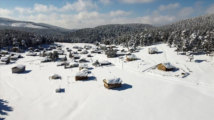 Bolu'da Köroğlu Dağları'nın yayla ve ormanları, aralıklarla etkili olan kar yağışıyla beyaza büründü.
