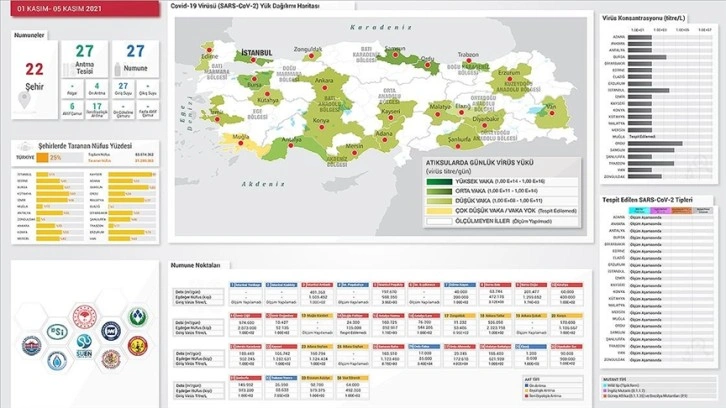 Tarım ve Orman Bakanlığına bağlı Türkiye Su Enstitüsü Başkanlığı (SUEN) koordinasyonunda yürütülen "Türkiye Genelinde Kovid-19 Yayılımının Atık Sularda SARS-CoV-2 Analizleri ile Takibi" projesi kapsamında, ülke genelinde 22 ildeki atık su tesislerinden alınan numuneler analiz edildikten sonra virüsün Türkiye'deki bölgesel yayılımı haritalandırılarak "covid19.tarimorman.gov.tr" adresinden yayımlanıyor.