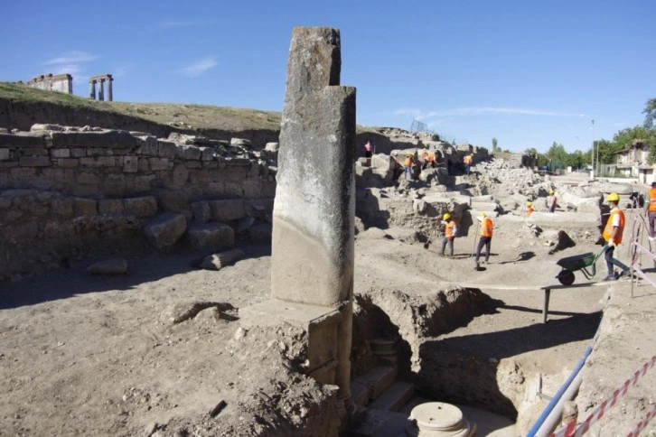 Burası daha önce üzerinden yol geçen bir alandı. Burada bir sütun mevcuttu. Renk farkından dolayı beyaz kısmın toprak altında kaldığı rahatça görünebiliyor. Bu sütun bize nirengi noktası oldu. Burası Agora'nın köşe sütunuydu. Kalpli sütün dediğimiz alanın iki tarafında sütun tamburu çıktı. Burası kazılmadan önce bu sütunu yerel halk 'Yaren Dede' olarak adlandırıyordu. Bir nevi çocuğu olmayan insanların gelip adak adadığı, tapınım objesi olarak bakılıyordu buna. Ama kazıldıktan sonra böyle bir şey olmadığı Agora'nın (Tapınağın giriş kapısı) köşe sütunu olduğu ortaya çıkmış oldu. Kazıda ceset, iskelet, kabire dair hiçbir ibare yok. Agora'nın zemini var. Vatandaşların bazıları kazıyı ziyarete geldi ve çok şaşırdılar. 'Yaren Dede olarak biliyorduk, meğer farklı bir şeymiş' dediler. İlçe sakinleri, yatırı kazdık diye tepki göstermedi. Onlarda bilgilenmiş ve bilinçlenmiş oldular” diye konuştu.