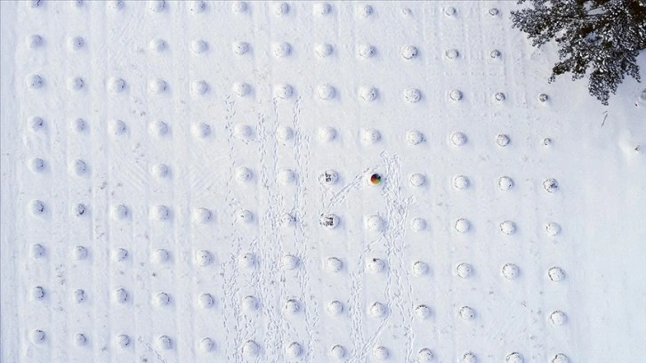 Ardıç ve çam ormanlarıyla çevrili Apa Yaylası'nda kış mevsiminde karın yağmasıyla beyaz örtüyle kaplanan lavanta bahçeleri, yaklaşık 1-1,5 metre çapında kar toplarına dönüştü.