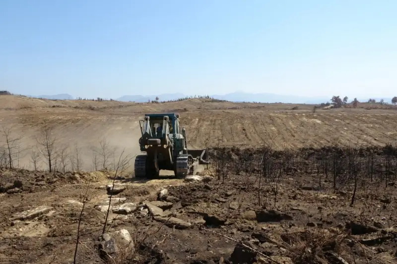 Yangından en fazla zarar gören yerlerden bir tanesi olan Kalemler Mahallesinde Orman Genel Müdürlüğü ve DSİ'ye ait iş makineleri yanan bölgeleri iş makineleriyle sürüp dikime hazırlıyor.
