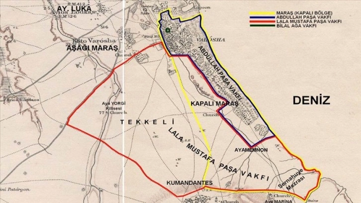 EVKAF, Maraş bölgesindeki arazilerin yüzde 100'ünün yasal sahibi olduğunu ve Kıbrıs, Britanya koloni yönetimi altındayken (1878-1960), varlıklarının hukuksuz bir biçimde şahıslara ve kurum ve kuruluşlara devredildiğini savunuyor.