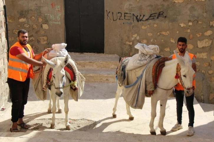 Mardin Artuklu ilçesi dar sokakları ile biliniyor. Mahalle aralarında bulunan tarihi yapılar yeniden restore edilip kullanıma açılıyor. Restorasyon çalışmaları sırasında eşekler molozları taşıyıp mesai yapıyor.