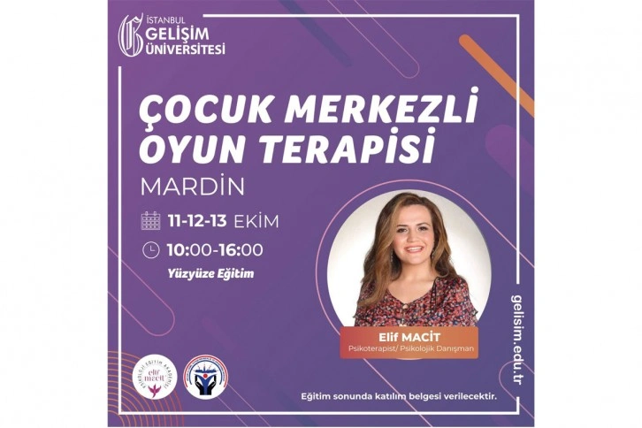 11 - 13 Ekim tarihleri arasında, tüm psikolojik danışmanların katılımına açık olarak düzenlenecek Çocuk Merkezli Oyun Terapisi Eğitimleri, Mardin'de başlıyor. Psikoterapist ve Psikolojik Danışman Elif Macit tarafından verilecek eğitimler, Artuklu Mardin Rehberlik ve Araştırma Merkezi ve İstanbul Gelişim Üniversitesi tarafından düzenleniyor.