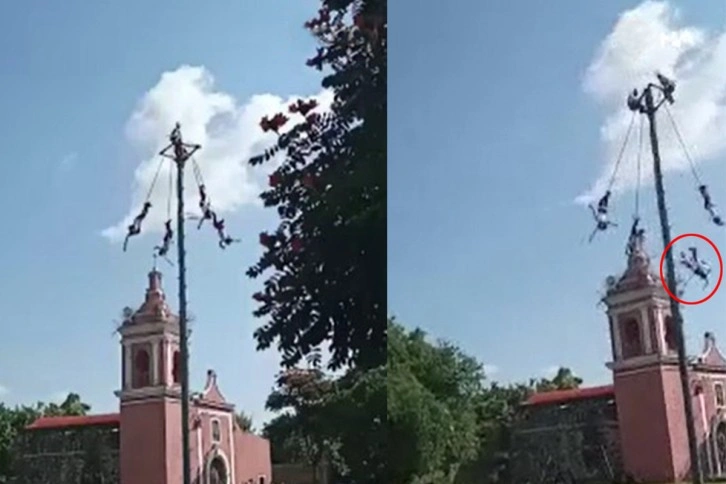 Meksika'nın Puebla eyaletine bağlı Huaquechula şehrinde dün Ölüler Günü etkinlikleri sırasında korkunç bir kaza meydana geldi. Etkinlikte baş aşağı bağlı oldukları direğin etrafında dönen 4 kişiden 1'i ipin kopması sonucu yaklaşık 20 metre yükseklikten yere çakıldı.