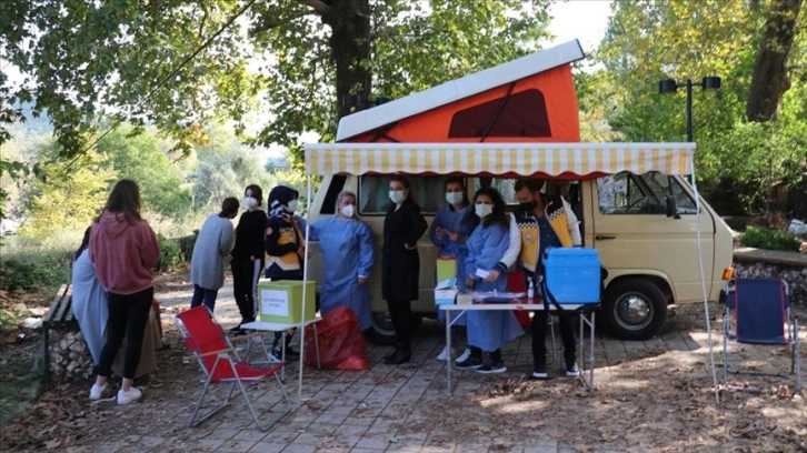 Tentesi, kamp masa ve sandalyeleriyle dikkati çeken aracın yanına gelen vatandaşlarla görüşen sağlık ekibi, aşı olmak istemeyenleri de ikna edip onaylarını aldıktan sonra aşılıyor.