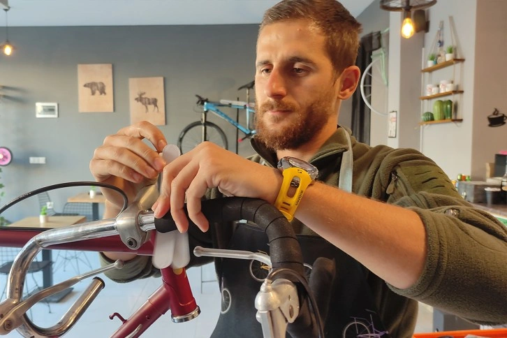 Yalova Üniversitesi Enerji Sistemleri Mühendisliğinden mezun olduğunu ifade eden Mehmet Doğan, "Üniversitede bisikletle tanıştım. Bu tutkumdan vazgeçemedim. Mezun olduktan sonra 3 ay bir iş yerinde mühendis olarak çalıştım, ama mühendisliği bıraktım. Kendime tamirhane açtım. Burada bisikletleri tamir ederken gelen müşterilerime kafeye dönüştürdüğüm tamirhanemde çay ve kahve hizmeti veriyorum. Burada tamirhane ve kafeyi aynı mekanda işletiyorum. Bursa'da böyle bir mekana ihtiyaç vardı. Biz buraya gelen bisikletçilerin burada rahat etmesini istedik. Ben mühendis olduğum için bisikletlerini tamir ve bakım için getirenlerin içi rahat. Ben bu sektörde iyi bir hizmet verebileceğimi düşünüyorum. Bisiklet bakımını 100 liraya yapıyorum. Buraya çok kaliteli bisikletler geliyor" dedi.