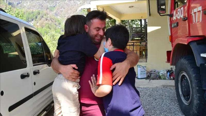 Antalya'nın Manavgat ilçesindeki orman yangınında arazöz üzerinde oğluyla yaptığı telefon görüşmesiyle hatırlanan orman işçisi Süleyman Harun Akıncı, çocuklarına kavuşmanın mutluluğunu yaşıyor.