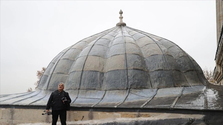 Kurşun kaplamaların üzerinde yürümek için uygun tabanlı ayakkabı tercih eden Şahin, merdiven yardımıyla çıktığı kubbeleri fotoğraflıyor.