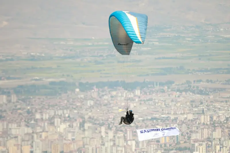 Paraşütlerinin altına bağladıkları “Aşımızı olalım” ve “Mavi bize yakıştı” yazılı pankartlarla Ali Dağı'nın zirvesinden havalanan pilotlar, ilçe üzerinde tur atarak farkındalık oluşturdu.