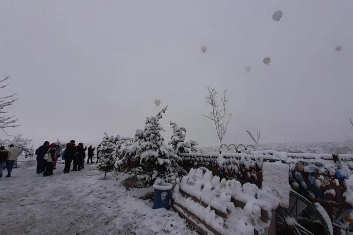 Beyaza bürünen bölgede balonlarla bol bol fotoğraf çeken yerli ve yabancı turistler, Kapadokya'nın eşsiz güzelliği karşısında hayranlıklarını dile getirdi.