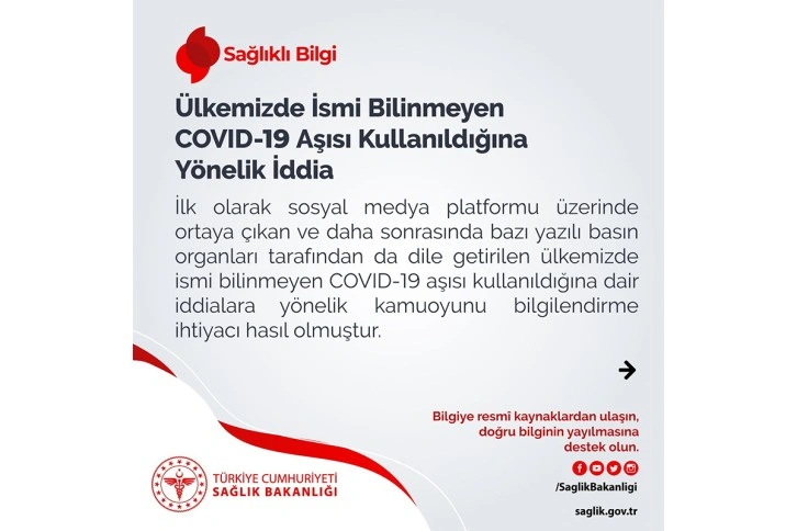 Sağlık Bakanlığı, sosyal medya yer alan ve bazı yazılı basın organları tarafından da yayınlanan 'Türkiye'de ismi bilinmeyen Covid-19 aşısı kullanıldığına' dair iddialara yönelik açıklamalarda bulundu. Açıklamada, “İsmi bilinmeyen aşı kullanıldığı iddiasıyla sosyal medya ve yazılı basında yer alan flakonlar ülkemizde kullanım onayına sahip BioNTech firmasının bir Uzakdoğu ülkesi için ürettiği aşılara aittir.Bakanlığımız ülkemizde Covid-19 aşılarının henüz yeterli bir miktarda olmadığı dönemde BioNTech firmasından tedariği hızlandırmasını talep etmiştir. Bunun üzerine BioNTech firması bir Uzakdoğu ülkesi için ürettiği aşıları ülkemize yönlendirmiştir. Yönlendirilen aşıların üzerinde yer alan etiketlerin Türkiye'de değiştirilmesi soğuk zincirin bozulmasına neden olacağı için etiket değişimi yapılmamıştır. Sonuç olarak sosyal medya ve yazılı basında yer alan aşılar, açıklama metnin sonunda yer verilen aşı paketi ve flakonu görselinde görüleceği üzere BioNTech firması tarafından üretilmiştir” denildi.
