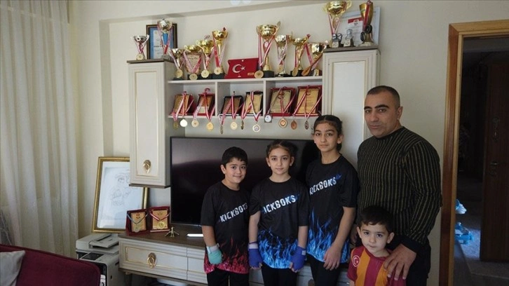 Erzincan'da yaşayan kick boks antrenörü Tuncay Palut, 5-11 yaş aralığındaki 4 çocuğunu sıkı antrenmanlarla şampiyonalara hazırlıyor.