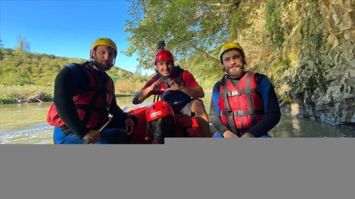 Bal'ın isteğini kabul eden Rafting İl Temsilcisi Birol Tepe, yelek ve kask giydirdiği köpeği bota yerleştirdi.