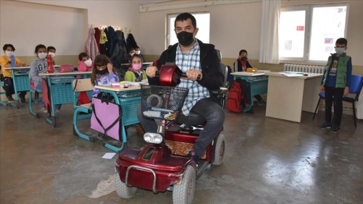 Neşetiye Ortaokulunda sosyal bilgiler dersi öğretmeni Mevlüt Uyanık (44), akülü tekerlekli sandalyesiyle, öğrencilerine eğitim veriyor.