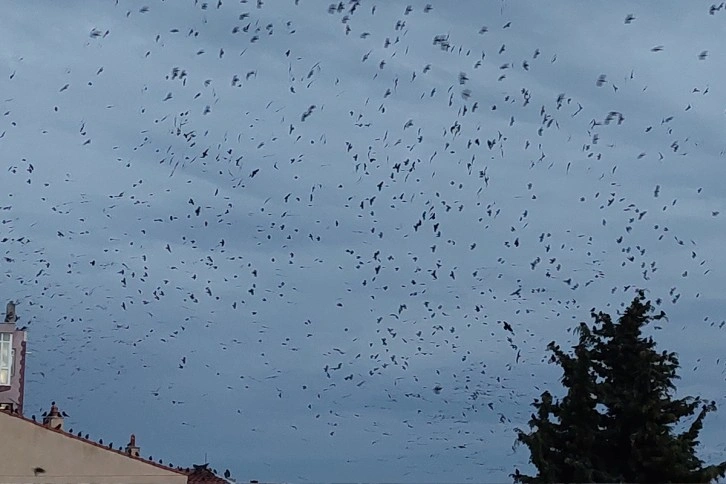 Gökyüzünü uzun bir süre işgal eden karga sürüsü, ilerleyen saatlerde ortadan kayboldu.