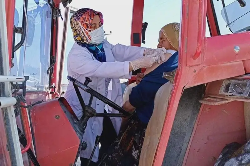 Kayseri İl Sağlık Müdürlüğü öncülüğünde yürütülen aşı çalışmaları tüm hızıyla sürüyor. Aşı haritasında da maviye dönen kentte mobil ekipler vatandaşların ayağına kadar giderek aşılarını yapıyor. Kocasinan ilçesine bağlı Yuvalı Mahallesi'nde aşı çalışmalarını sürdüren ekipler, aşı zamanı gelen Ayşe teyzeyi traktör üzerinde çalışırken buldu. Rahatsızlığından dolayı traktörden inemeyen Ayşe teyzeye ekipte yer alan Sariye ebe traktörün üzerinde aşısını vurdu.Ali Göç
