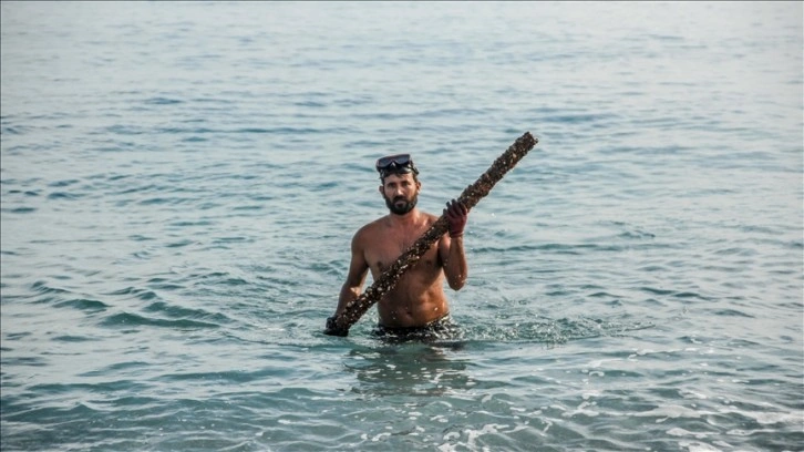 Dünyaca ünlü Konyaaltı Sahili'ndeki eski iskelelerden kopan ve gemilerden denize atılan, boyları zaman zaman 2 metreyi aşan demir metal parçalarını tüpsüz dalış yaparken fark eden özel bir şirkette şoför 34 yaşındaki Erhan Uludağ, her dalışta bu atıkları toplamaya başladı.