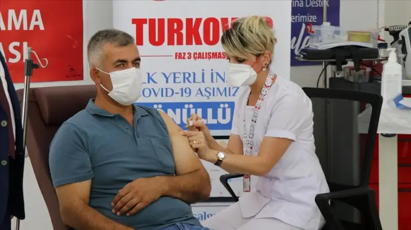 Hastanede oluşturulan TURKOVAC Aşı Çalışma Merkezi'nde, 45 yaşındaki Mustafa Altuntaş'a Türkiye'nin ilk yerli Kovid-19 aşısı yapıldı.