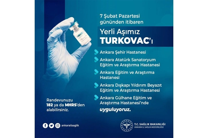 Covid-19 ile mücadele kapsamında Prof. Dr. Aykut Özdarendeli ve ekibi tarafından geliştirilen yerli inaktif korona virüs aşısı TURKOVAC, Başkent'te 7 Şubat Pazartesi itibariyle 4 hastanede daha uygulanmaya başlıyor. Hali hazırda Ankara Şehir Hastanesi'nde uygulanan TURKOVAC bu hastaneye ek olarak, Atatürk Sanatoryum Eğitim ve Araştırma Hastanesi (EAH), Ankara EAH, Dışkapı EAH ve Gülhane EAH'de de uygulanmaya başlıyor. TURKOVAC aşısı için Merkezi Hekim Randevu Sistemi (MHRS) ya da Alo 182'den randevunuzu alabilirsiniz.