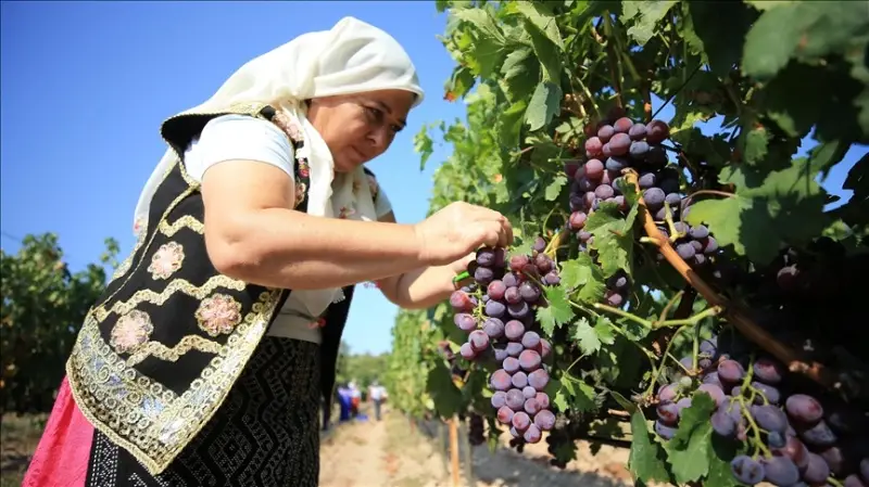 Lezzetiyle Türkiye'nin dört bir yanından alıcısı bulunan üzümleri yöresel kıyafetler giyen kadınlar, şarkılar ve türküler eşliğinde topluyor.