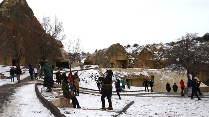 Peribacaları ve doğal kaya oluşumları arasında gezinti yapan ziyaretçiler, kar yağışı ile beyaza bürünen bölgede çeşitli tur aktivitelerine katılarak eğlenceli vakit geçiriyor.