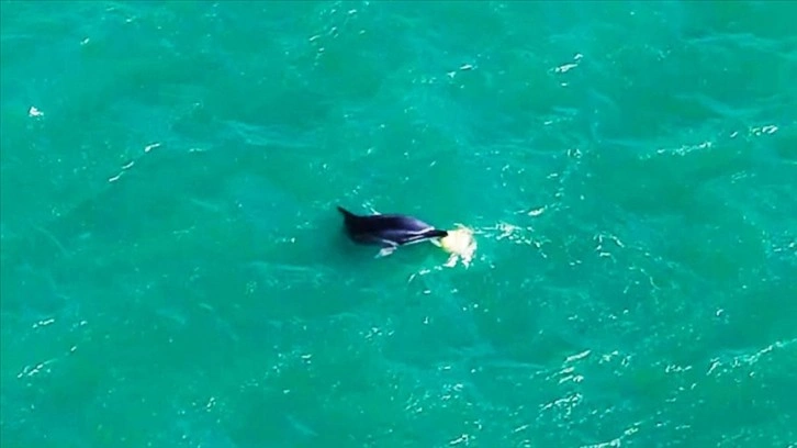 Teknenin şamandırasıyla adeta top gibi oynayan yunus, bir süre sonra gözlerden kayboldu. Yunusun oyunu, drone ile görüntülendi.