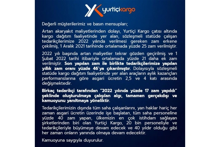 Tedarikçilerimizin dışında tüm saha çalışanlarını, yan haklar hariç her zaman asgari ücretin üzerinde işe başlatan, tüm saha personeline yüzde 40 zam yapan, ülkemizin en çok istihdam sağlayan şirketlerinden biri olan Yurtiçi Kargo, 20 bin personeliyle ve tedarikçileriyle büyümeye devam edecek ve 40 yıldır olduğu gibi her zaman onların yanında olmaya devam edecektir'' denildi.