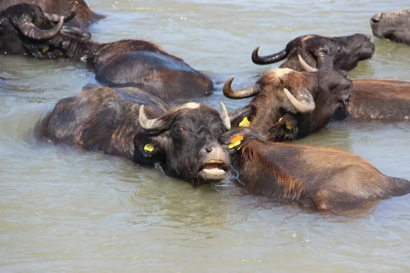 Güneşin en dik olduğu zamanlarda suya ve çamura giren mandalar, akşam üstü merada otlanmak için çıkış yaparak daha sonra çamurlara yatıyor.