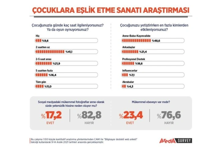 Araştırma şirketi Areda Survey'in çocuk-ebeveyn ilişkisine yönelik yaptığı çalışmada, teknolojinin aile içi iletişimdeki etkisi, anne ve babaların çocuğun karakterine etkisi ve mükemmel ebeveynlik soruları CAWI yöntemiyle bin 100 kişiye yönlendirildi. Aile Danışmanı ve Yazar Hilal Çorbacıoğlu'nun sonuçlarını yorumladığı araştırmada Türkiye'nin çocuk yetiştirme algısı üzerine ilginç bulgular ortaya çıktı.