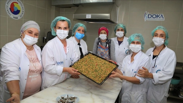 İmalathanede, kooperatif çatısı altındaki 15 kadının ürettiği Laz böreği ve hamsili ekmek satışa sunuluyor.