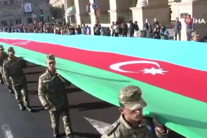 Azerbaycan'ın İkinci Karabağ Savaşı'nda 44 günün ardından Ermenistan'a galip gelmesinin üzerinden 1 yıl geçerken, kutlamalar kapsamında 440 metrelik dev Azerbaycan bayrağıyla geçit düzenlendi.