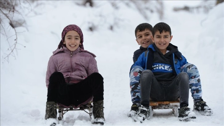 Bingöl'ün Ilıcalar beldesinde çocuklar karın keyfini kendi imkanlarıyla yaptıkları kızaklarla çıkarıyor.