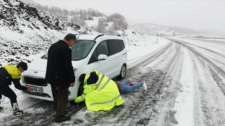 Aracın lastiklerine zincir takan trafik polisleri, ailenin yola devam etmesini sağladı.