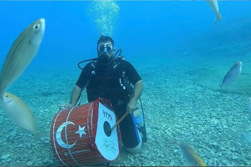 Yıllardır Tekirdağ'da düğünlerde ve özel gecelerde davul çalan Tekirdağlı Asma Davul Virtüözü Ahmet Çelik, davuluyla ilklere imza atıyor. Daha önce 2 bin metrede paraşütle havalanarak davul çalan Tekirdağlı Asma Davul Virtüözü Ahmet Çelik, yeni bir çılgın çalışmaya daha imza atmak için davulu ile Muğla'nın Fethiye ilçesinde denize daldı. Denizin en dibine dalan Çelik, suyun altında davulunu çalmaya başladı. Balıklar arasında davul çalan Çılgın Davul Virtüözü Çelik'in o anları renkli görüntülere sahne oldu.