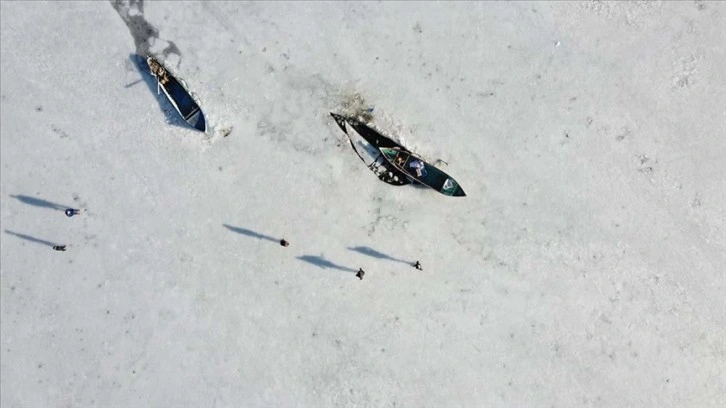 Gölün yüzeyinde oluşan 30-40 santime kalınlığındaki buz nedeniyle balıkçı tekneleri limanda mahsur kaldı.