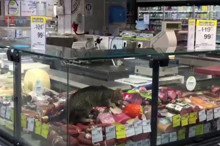 Kameraya yansıyan görüntülerde şarküteri reyonuna giren kedinin kavurmayı yemesi yer alıyor.